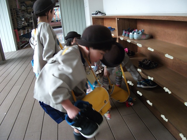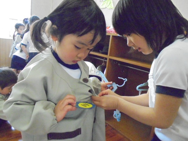 登園されてさっそく靴箱へ・・・ 自分の靴箱わかるかな? 自分の名札を見て靴箱の名前を確認されます。 間違えて前の靴箱にいってしまい 「・・・・・・あれ?」 そんなこどもたちの姿もありました。 「担任の先生はだれかな~???」 どきどきわくわく新しいお部屋へ☺ 重たい荷物も自分で持ちます!! お道具箱も自分で出します!! 「かたい・・・でも自分でする!」 そこには1つ大きくなってたくましいこどもたちの姿が☆彡 新しいお部屋で思いっきり遊ぶ年長さん 懐かしい前のお部屋で遊ぶ年中さん 幼稚園でたっぷり遊びます☺ 「おはよ~するよ~!!」 新しいお部屋でおはようです。 「おはようございます」 新しいクラスはなんだか新鮮です。 講堂に集まり始業式 年長さんピシッと並ばれさすがです!! 年中さんも、年長さんのまねっ子 とってもかわいいです。 始業式が終わるとすぐにお帰りの用意 先生に名札を付け替えてもらいます。 年長さんはシールを貼ります。 「名前分からへんかったら、どこか教えてあげる」 ドキドキわくわくの新学期・・・