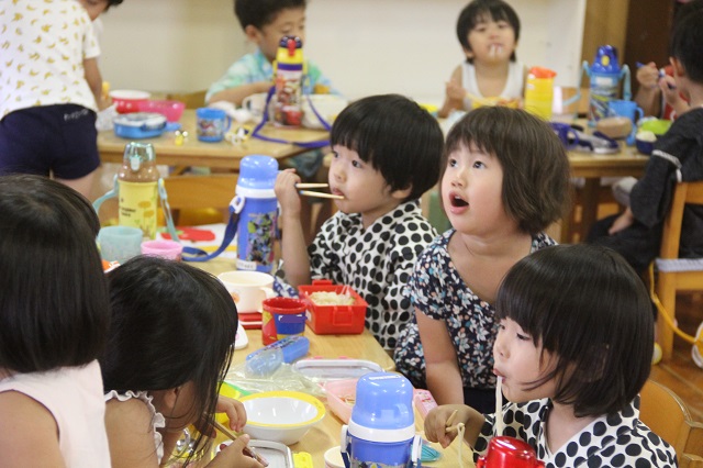園長先生にたなばたの紙芝居を読んでもらいました。 子どもたちのお昼ご飯は全員おそうめん!! 手作り梅ゼリー金平糖入り★☆★ 子どもたちの喜びようは言うまでもなく・・・☺ 星はいつも輝いて子どもたちの願いと夢を優しくあたたかくみまもってくれているはずですね