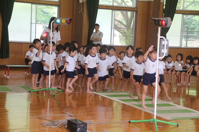 年中さんは、青の点滅が始まると渡らずにストップ!!
